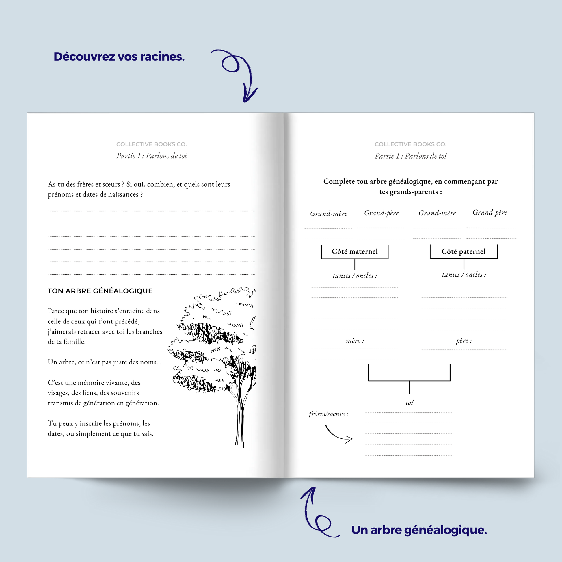 120+ questions inspirantes, un arbre généalogique, des pages libres et un emplacement pour vos photos.
